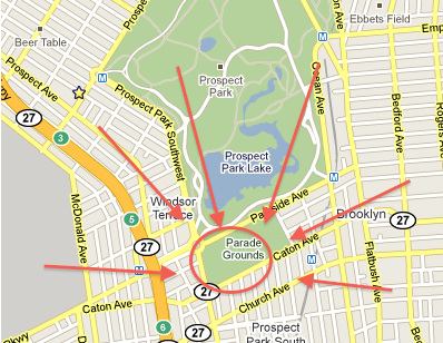 7TH AVENUE STOP On exiting the train station orient yourself to be on ninth street. Walk uphill on ninth street this will take you into the park. Continue along the paved path straight, as if ninth street never ended. Walk across west drive and continue straight. You will start to go downhill and see the ballfields. We generally play on the one marked blue on the map, Field 6, but sometimes we play on the one marked yellow, Field 5,due to overcrowding, field conditions, getting there first, or evil spirits. Be sure to look for us on any field if we are not on one of those main fields. |